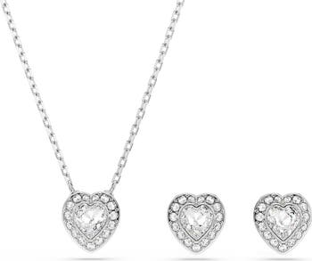 Complete a romantic look with this stunning Swarovski crystal stud earrings and necklace set showcasing luminous hearts framed by dainty halos.