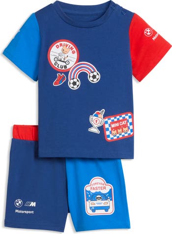 Graphics inspired by the BMW M4 EVO rev up the fun of wearing a logo-marked T-shirt and coordinating shorts sized for kids who like to ride and relax in the comfort of soft, breathable cotton. They pair well together and drive separately with other favorite looks to keep your little one crossing the finish line with winning style.