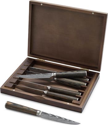 What it does: These steak knives feature a Damascus steel design and extra-sharp edges that can handle tough meats. They're perfectly weighted for remarkable balance and durability. The hand-finished wood and polymer handles offer classic style, modern durability and a comfortable shape for total control and cutting confidence.