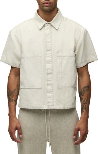 In collaboration with visionary Creative Architect Brandon Williams, this short sleeve button-up redefines casual chic with its relaxed, slightly cropped fit. Crafted from structured cotton moleskin, it showcases front patch pockets with side access, hidden center-front buttons and striking contrast stitching.
