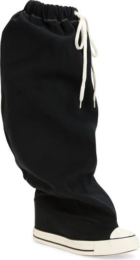 This slouchy sneaker-inspired boot—part of a collab with Converse—is made from waxed canvas and built with an internal wedge heel for lift. Elastic and a drawstring secure the fit at the leg, while two rows of contrast topstitching highlight the back. Wholly owned by Comme des Garçons, this brand is part of Dover Street Market Paris, created with the goal of bringing emerging brands to market.