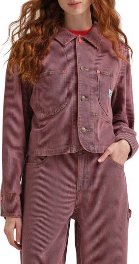 From the crayon box to the workshop, this cropped cotton chore jacket in colorful railroad stripes proves utility and style can coexist.