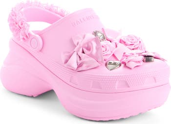Satin and grosgrain ribbons and roses mix with silvery charms on the front of this clog that's a collab between CROCS and Balenciaga. Ruffled ribbons and lace embellish the slingback strap to balance out the design.