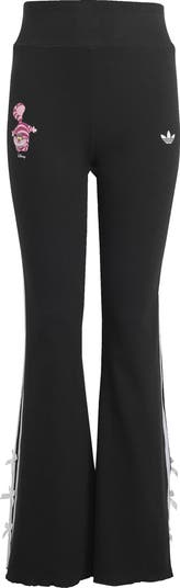 The Cheshire Cat and adidas lend their signature stripes to these kid-size ribbed flare leggings sweetened with dainty bows.