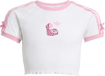 The Cheshire Cat and adidas lend their signature stripes to this cropped T-shirt made just for kids from stretchy ribbed fabric.