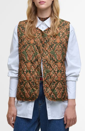 The brand known for its premium outerwear meets the resortwear glamour of apparel icon FARM Rio with this collaboration-capsule vest in a boldly patterned and diamond-quilted design.