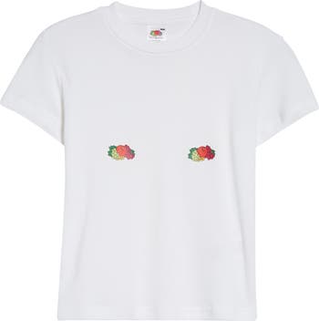 Part of a collaboration with heritage American sportswear brand Fruit of the Loom, this cotton-blend baby tee features amusingly placed logos displaying the partnership of the two brands.