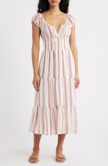 A breezy, effortless midi in lightly textured cotton, the Daria dress features a scoop neckline with center ties, ruffle-trimmed short sleeves, a smocked waist and a fully lined tiered skirt.