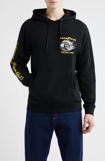 Race into the weekend in a comfy hoodie made from a soft cotton blend and popped with a cool, vintage-inspired graphic at the chest and sleeve.