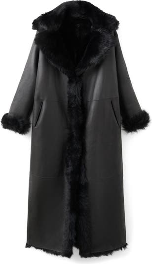 Supple leather reverses to fluffy genuine shearling on this dramatic longline coat that's part of Mango's collaboration with actress/model Kaia Gerber.