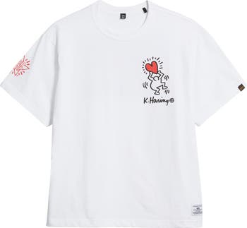 Consider this cotton crewneck T-shirt a wearable timeline of Keith Haring’s graphic universe. The chest features 'Heart Man,' originally created for a 1983 Shafrazi Gallery exhibition poster, the right sleeve carries the Pop Shop star logo and the center back bursts with his iconic characters rooted in the 1987 Luna Luna tarp paintings in Hamburg.