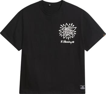 This cotton crewneck T-shirt brings Keith Haring’s Pop Shop energy to the everyday with a star graphic at the chest and a bold rendition across the center back. The free-standing star nods to the original Pop Shop sign while the back design borrows directly from the drawstring shopping bags made for the shop.