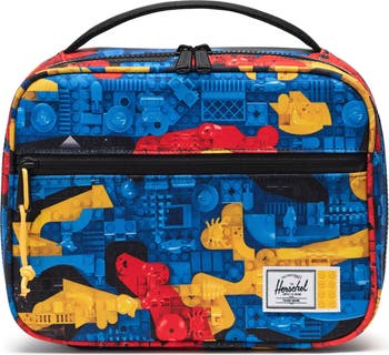 A waterproof zipper seals a front pocket for extra storage in this kid-size lunchbox featuring a fun pattern created in collaboration with LEGO and an insulated interior that easily wipes clean.