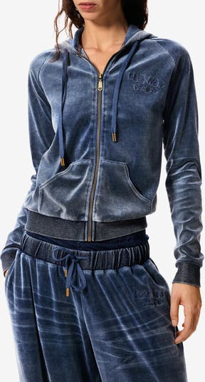 Channel unmistakable retro style in this soft velour hoodie complete with tonal logo embroidery at the chest.