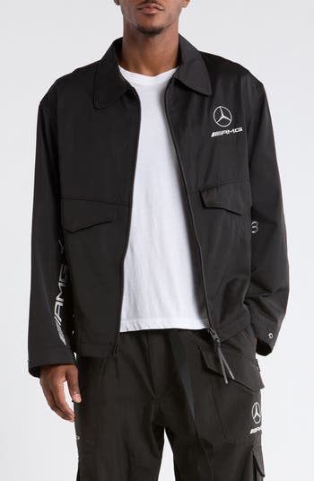 Channel the adrenaline-spiking speed of the F1 track with this sleek jacket detailed with Mercedes-AMG logos that simulate those found on the real deal.