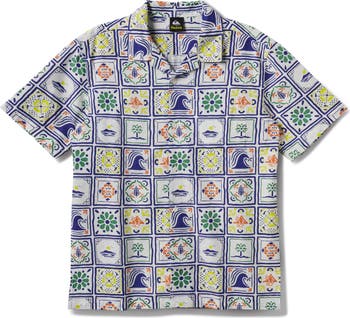A tile print of aquatic images covers a resort-ready sport shirt made from breathable cotton and linen.