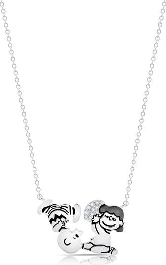 The iconic Charlie Brown and Lucy football scene is outlined in glossy black enamel and lit with flawless hand-set cubic zirconia on the pendant of this delicate chain-link necklace.