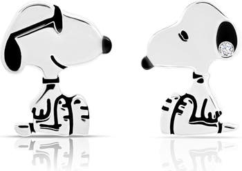 Offering playful shine for every day, these mismatched studs spotlight a polished Snoopy motif traced in glossy black enamel and punctuated by a single round cubic zirconia for just-right sparkle.