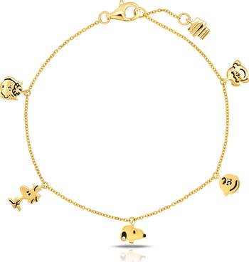 All your favorites, all in one playful bracelet—dangling charms of Snoopy and the gang shine with polished 18-karat-gold detailing and crisp black enamel accents, while hand-set cubic zirconia add just-right sparkle.