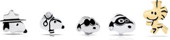 Bring the iconic duo to your ear stack with this playful stud set featuring five designs of Snoopy’s expressive faces detailed in glossy black enamel with hand-set cubic zirconia and a raised Woodstock.