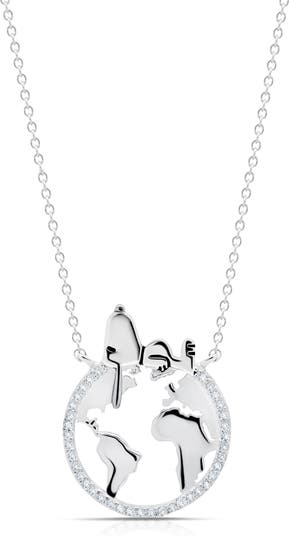 This pendant necklace brings worldly whimsy with a hit of sparkle in a globe silhouette encircled in hand-set cubic zirconia pavé and accented by Snoopy in hand-painted black enamel for playful contrast.