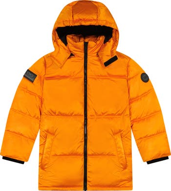 Your youngster is sure to stay warm and cozy in this puffer jacket that reverses from a solid side to one patterned by a scenic rocket graphic.