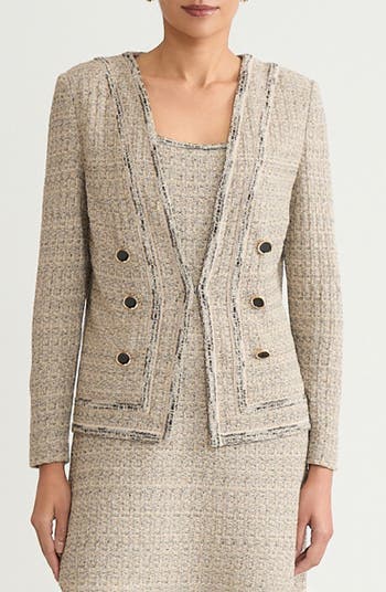 Bring classic polish to your ensemble in a poised tweed jacket updated with contrast trim and shimmering finish.