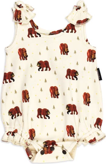 A whimsical print inspired by a timeless tale covers an organic-cotton tag-free bodysuit detailed with ruffles and bows for added charm.