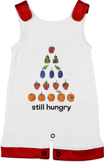 A whimsical print inspired by a timeless tale enlivens an organic-cotton tag-free romper fitted with snaps at the shoulders and between the legs for easy changing.