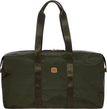 The large 2-in-1 foldable holdall from the X-Collection is made of soft, lightweight and durable recycled fabric, water-resistant. The detachable internal zipped pocket can be used as practical make-up bag or mini bag thanks to the included shoulder strap; the entire holdall can also be folded up and stored inside. This holdall can be carried by hand or on the shoulder using the handles. There is a strap on the back to attach it to a suitcase handle. Its spacious design makes it particularly practical. The main compartment is equipped with a zip with two sliders. Embellished with genuine leather details, one of Bric's signature design elements.