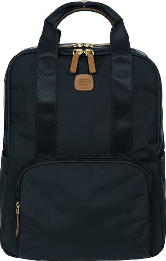 Medium backpack from the X-Travel collection in satin nylon with leather finishings. EXTERIOR: zipped front pocket; double leather handle on the top; adjustable shoulder straps INTERIOR: two compartments accessible through the double top zip: the rear one features two laptop and tablet compartments with a Velcro fastening, the forward one with zipped pocket.