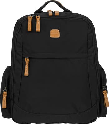 Large backpack from the X-Travel collection in satin nylon with leather finishings. EXTERIOR: front zipped pocket; leather top handle; adjustable shoulder straps; two zipped side-pockets; rear strap with pocket for attaching the backpack to trolleys. INTERIOR: the first compartment includes a zipped pocket and a large compartment with an inner key holder in leather; the second includes a compartment with a Velcro fastening, where you can conveniently place a laptop and iPad in two separate pockets.
