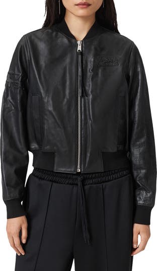 A sleek bomber jacket is cut from soft leather in a slightly cropped silhouette with ribbed trim and logo embossing at the sleeves and chest for an on-brand touch.
