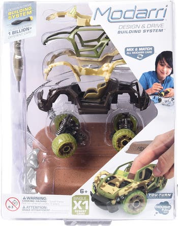 MODARRI: X1 DESERT CAMOUFLAGE CAR - The Mix-and-Match Modarri Building System allows you to design your own custom super car. Includes interchangeable parts that allow for endless car designs! It's fun and easy to build your car by stacking the pieces and then tightening a few built-in-screws! Cars have amazing driving mechanism with real steering and suspension - just put your finger in the driver's seat and GO! IT'S EASY AS 1, 2, 3! 1. DESIGN: Modarri's Mix-and-Match Building System allows you to design your own custom car. 11 interchangeable parts per car allows for BILLIONS of car designs! 2. BUILD: Super Quick Build Times! Modarri cars are built in less than a minute! Easily build your car by stacking the pieces and then tightening a few built-in-screws with the included hex screwdriver. 3. DRIVE: Modarri cars amazing driving mechanics! Put your finger in the driver's seat and just point where you want to go! The power of your custom supercar is at your fingertips!