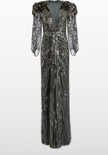 This evening gown embodies dramatic sophistication, with its plunging neckline, ruched waist detailing, and floor-sweeping silhouette. Sheer embellished sleeves and softly structured shoulders add depth and couture-like presence, while the intricate sequins throughout create a dazzling light-catching effect. The fluid drape enhances movement, balancing elegance with bold statement design. Perfect for gala dinners, red carpet moments, or exclusive evening events, this gown guarantees a striking and unforgettable entrance.