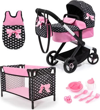 - 10PC MEGA SET - PLAY WITH YOUR DOLLS IN STYLE: This 10pc set features a pram, carry cot and doll care accessories. Suitable for dolls and plushes ups to 18". The set features a lovely black, pink and hearts design.
