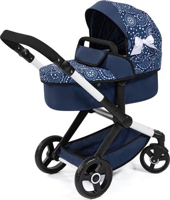 BAYER DESIGN DOLLS: XEO PRAM - BLUE, WHITE, CIRCLES - The combi doll’s pram XEO has a modern design and is suitable for dolls and stuffies up to 18"/46 cm. With its adjustable handle, this doll's pram is easily adaptable to your child's height; also, it's possible to mount the carrycot in direction of travel or towards your child. With the reversible handle a change of the direction is also possible. The doll’s pram can be easily converted to a pushchair with press buttons and with the change of the angle of the carrycot. The carrycot’s cover will either way; if she's sitting or lying in the pram; protect the little doll from sun and wind. The swivel front wheels assure a stable cornering. The accompanying bag has a long handle to be used as a shoulder bag and two short ones as a hand bag. Additionally, it includes a zipper to close the bag safely. For more storage space the integrated shopping basket is also perfect to keep everything stored. INCLUDES: 1 Dolls Pram, 1 Shoulder Bag. Designed for dolls up 18" (46cm) * Doll not included. Suitable for boys and girls ages 3 and up.