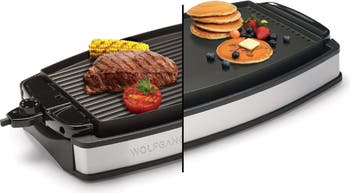 - XL, REVERSIBLE GRILL/GRIDDLE – Two appliances in one. Grill on one side, griddle on the other. Wolfgang Puck’s oversized 1800 watt electric griddle features a reversible cooking plate that offers both grill and griddle options. Perfect for indoor grilling, large meals or family breakfasts, this grill griddle has you covered from pancakes to steaks. Plus, the extra-large 207 square inch cooking surface allows you to cook for up to 8 people at once.