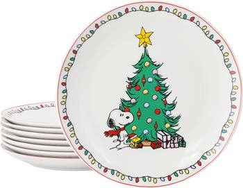 Celebrate the holidays with the Peanuts Xmas 8 Piece 10.5 Inch Round Stoneware Dinner Plate Set, featuring a charming Xmas tree design. Each plate has a smooth glossy finish and is perfect for serving holiday meals or everyday dishes with a cheerful touch.Durable, microwave safe, and dishwasher safe, these plates make mealtime both fun and convenient. Ideal for seasonal entertaining or gifting, they bring nostalgic Peanuts charm to any table setting. The vibrant holiday artwork stays bright even after repeated use, ensuring lasting enjoyment year after year. A must have for Peanuts fans and anyone who loves adding whimsical holiday style to their kitchen.