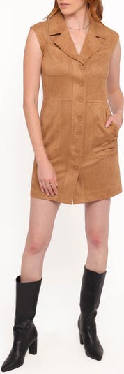 Buttery soft faux suede adds season-perfect texture to this sleeveless shirtdress cut in a leggy length.