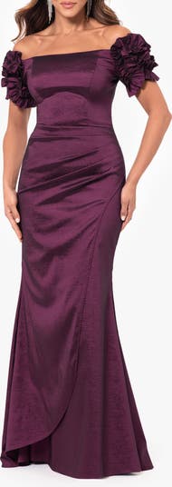 A regal shade and flowering sleeves animate a glamorous gown cut from swishy taffeta.