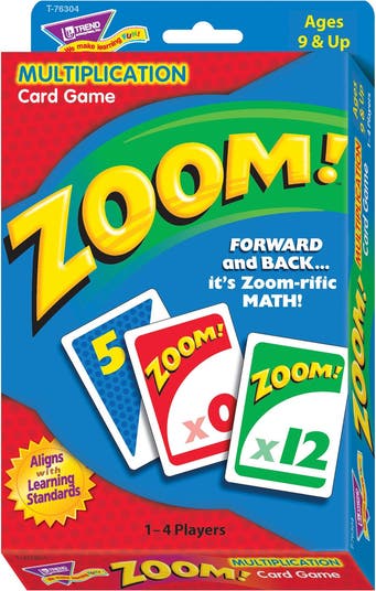 Zoom into addition and multiplication basics with this fast-paced card game kids and adults will all enjoy! Flip over cards and add the point values on the cards - draw as many cards each turn as you dare, but beware! Surprise ZOOM!™ and BOOM! cards will speed you up, slow you down, or send you in reverse. First player to reach a cumulative score of 500 crosses the finish line! Designed for players ages 9 and up (grade 4 and older); as many as 4 individuals can participate in the same round. Set includes 100 playing cards and instructions in a convenient storage tray and reclosable box. Made in the USA for reliable quality and product safety.