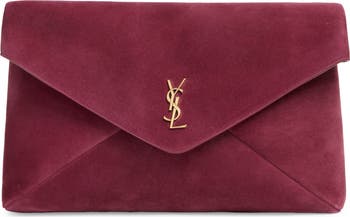 House-signature Cassandre hardware depicting the iconic interlocking monogram glints at the front of this super-spacious envelope-style clutch crafted in Italy from supple suede.