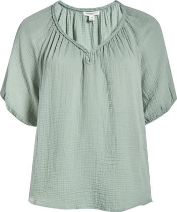 Cut from light and breathable cotton gauze, this blousy top is accented with neckline braiding and framed by billowed raglan sleeves.