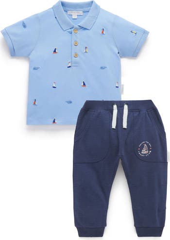 Our Yacht Polo Set is a great outfit for play. Featuring a functional and stylish polo shirt with an all over embroidery of yachts and whales, and comfortable slouchy pants made from stretchy unbrushed fleece. Made from our 100% Cotton for a soft and breathable outfit.