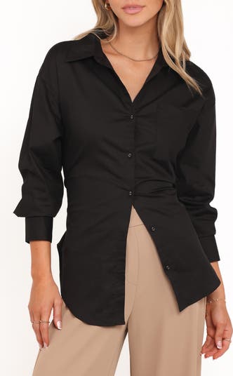 Get a perfect fit every time you step out in this crisp cotton button-up shirt with lace-up ties in the back that cinch your silhouette.
