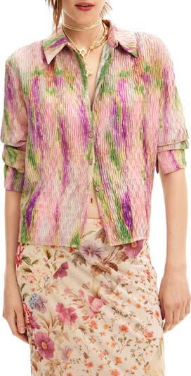 An impressionistic pattern enhances the artistic flair of a textured button-up shirt that puts a fresh twist on a classic style.