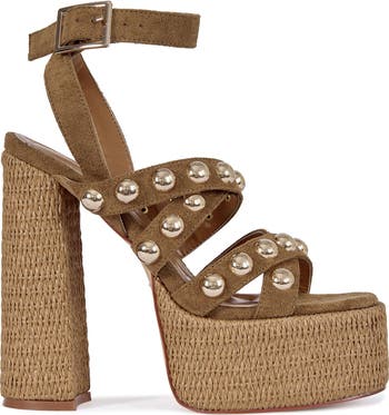 All summer long.Platform sandal with a woven sole and brown crisscross straps adorned with gold studs-casual, chic, and effortlessly summer-ready. Heel height: 5"Platform height: 2"