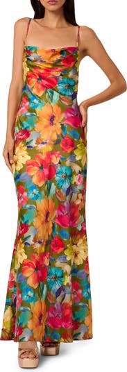 Bring the garden to the party in a slinky satin dress bursting with blooms and dipped low at the back.
