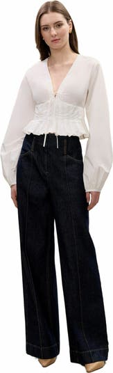 This poplin blouse embodies refined elegance in pristine milk white, featuring a graceful front tie closure and intricate pleated bodice detailing. The long-sleeve design showcases pure cotton craftsmanship, where architectural pleats meet feminine draping to create a piece that's both sophisticated and effortlessly romantic.